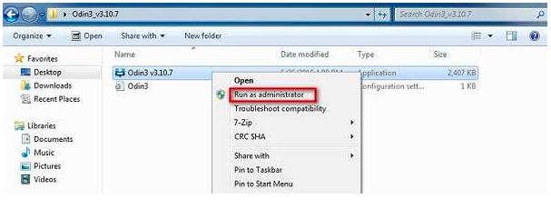 • Jalankan aplikasi Odin yang tadi sudah anda downlaod, dengan cara klik kanan “Run as administrator” pada Odin.exe untuk membuka aplikasi