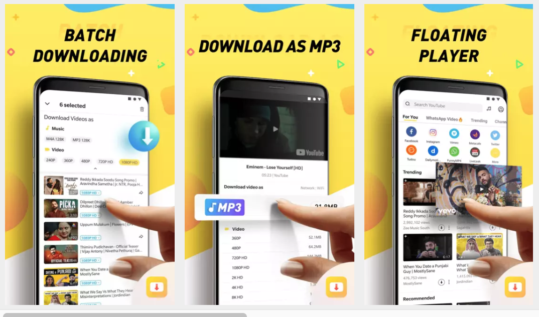 Anda dapat memilih mutu pengunduhan demi menghemat ruang memori ponsel Anda. Anda juga dapat memilih untuk mengunduh audio saja, yang berguna jika Anda ingin menyimpan lagu atau album. Versi terkini aplikasi ini juga dapat mengunduh video Facebook dan Instagram.