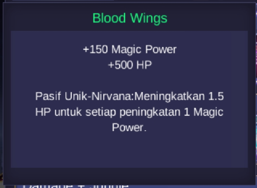 Gunakan Blood Wings untuk mendapatkan pasin unik nirvana yang akan meningkatkan 1.5 HP untuk stiap peningkatan magic power pada hero kimmy