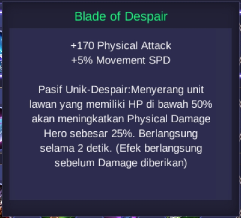 Gunakan item Blade Of Despair : Untuk mendapatkan pasif unik despair yang berfungsi menyerang unit lawan dengan memiliki hp di bawah 50% yang akan meningkatkan