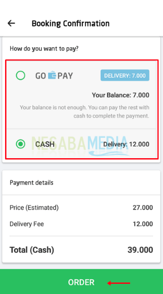 Selanjutnya anda akan di hadapkan pada bagian boking informasi, anda dapat memilih Go Pay atau juga dapat memilih Cash untuk dapat melanjutkan orderan