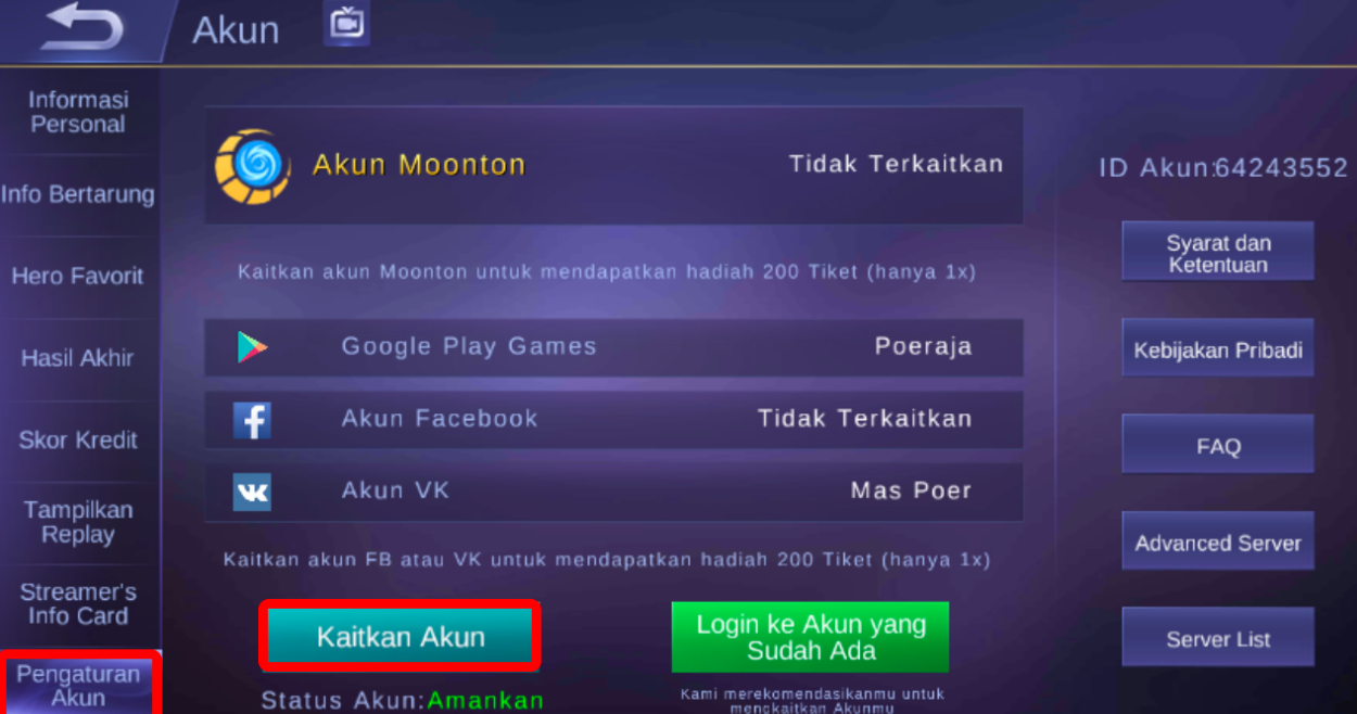 Seperti di katikan dengan akun Facebook, akun Google Playgames, akun VK dan akun Moonton. dan bila memang perlu sebaiknya anda taukan pada smua media sosial yang sudah admin sebutkan di atas di karenakan tak jarang juga media sosial kita seperti facebook terkenak hak