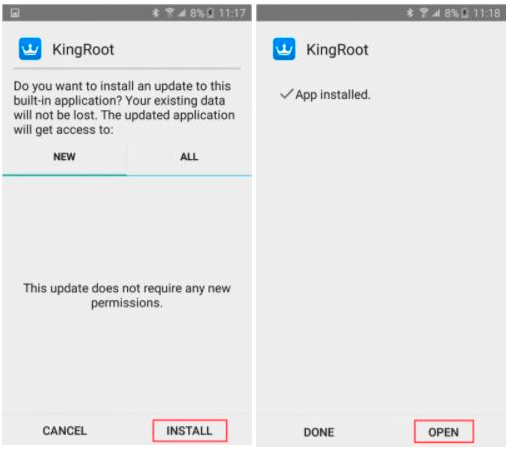 4. Pilih “Install” untuk mulai proses installasi Kingroot, jika sudah selesai pilih “Open” untuk membuka/menjalankan aplikasi Kingroot.Start Install