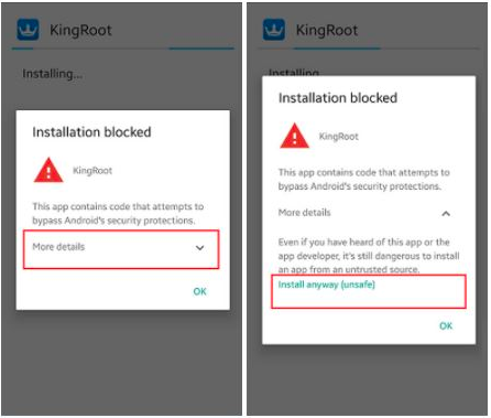 Jika mendapatkan pesan “Google installation blocked message” sepetrti gambar di bawah , pilih “More details” lalu pilih “Install anyway (unsave)” dan “Ok”.