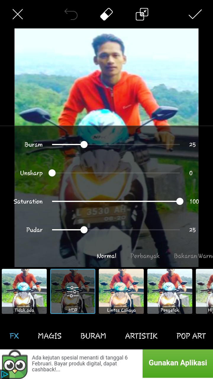 hasil foto kita menjadi sangat memuaskan, Jadi ini menurut saya cara paling mudah edit foto di android menjadi fokus backround menjadi blur dan full HDR,