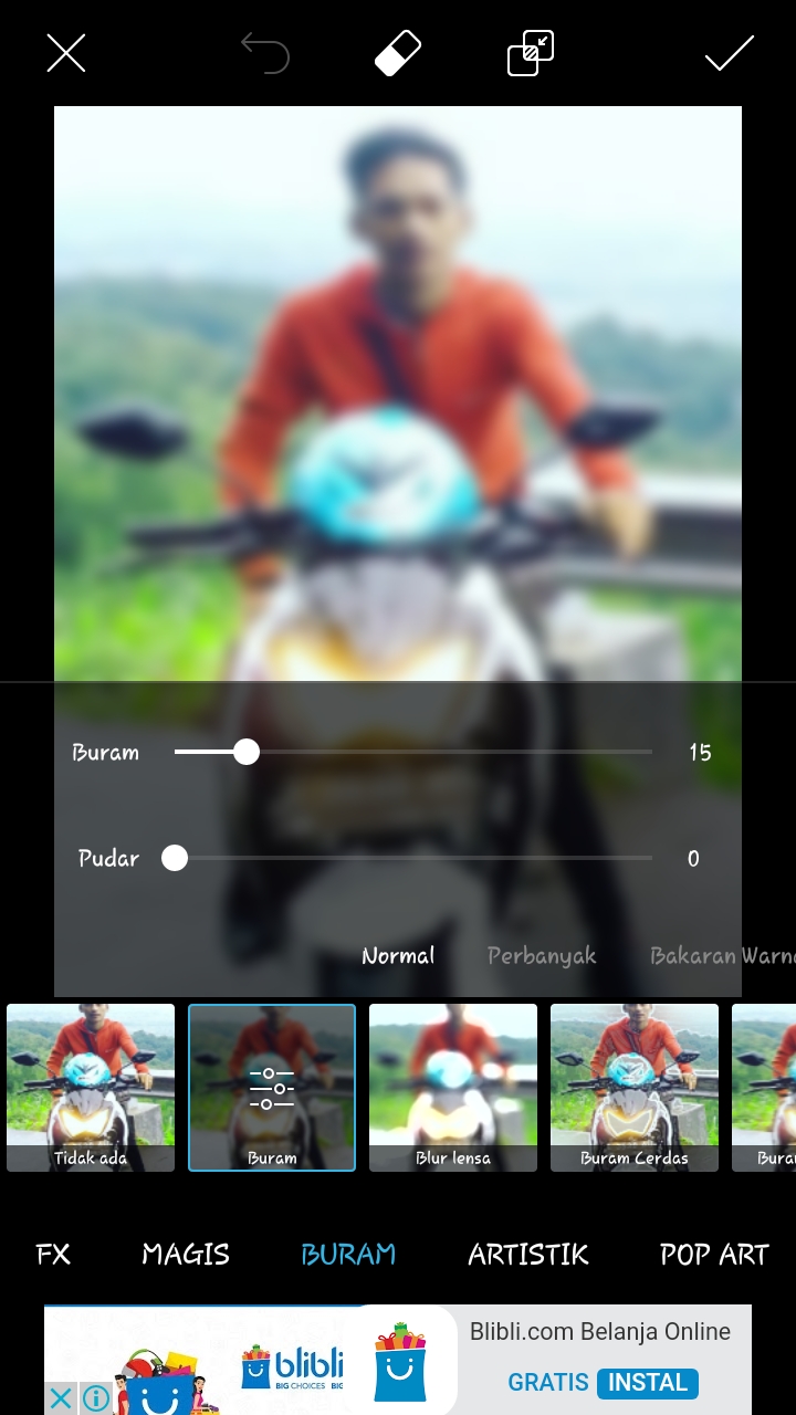 Namun di seleksi otomatis bawaan dari aplikasi picsArt tidak sempurna, kiata dapat menggunakan cara manual pada tahap ini , silakan kalian pilih logo penghapus, dan hapus pada bagian bagian yang tidak kita inginkan agar blur, Hasilnya maka akan seperti gambar di bawah