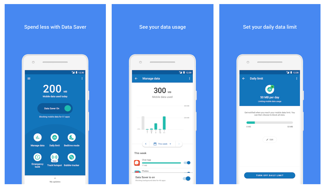 Penghematan aktual mungkin bervariasi, dan bergantung pada perilaku penggunaan individu itulah beberapa fitur dari aplikasi penghemat data yang telah di buat oleh google