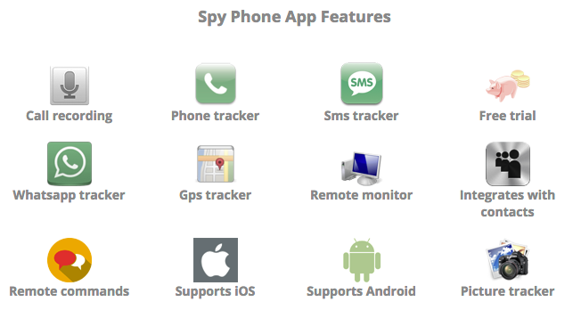 Supports Android, Picture tracker, Mms tracker, Browser tracker, Track multiple phones, Logs configuration, Facebook tracker, System logs,