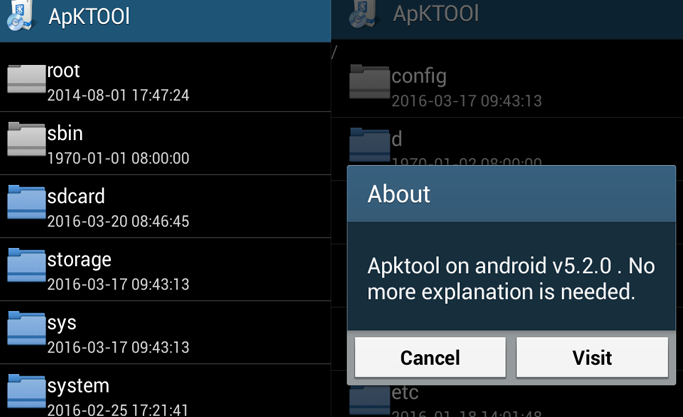 Silahkan hapus versi lama sebelum menginstal APK Tool v8.2.0 (jika pernah memasang versil lebih lama). Update terbaru di akhir 2016. Untuk instalasinya seperti biasanyA download aplikasi sesuai arsitektur OS dan chipset dan pastikan centang pilihan unknown source agar bisa melakukan instalasi dari sdcard.