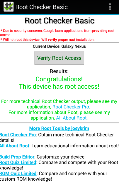 Root Checker ini akan memeriksa apakah Anda memiliki hak istimewa sebagai Superuser dengan mengirimkan permintaan pada perangkat. Tergantung pada jawaban yang diperoleh, Anda akan mendapatkan informasi dengan jelas apakah posel anda sedang di root atau tidak.