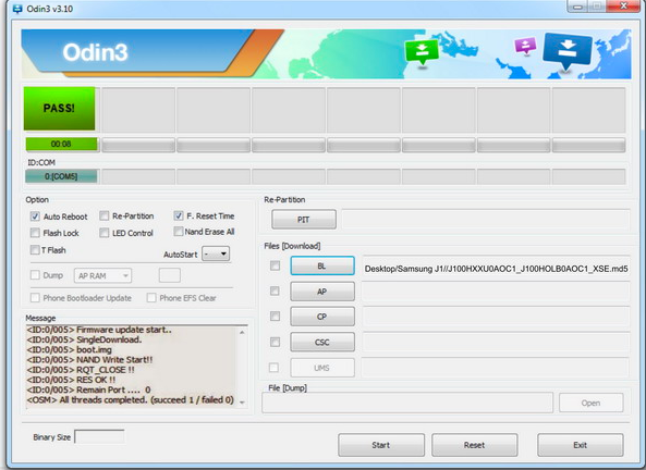 - Proses Flash samsung akan berhasil selesai akan di tandai muncul tulisan PASS . Seperti gambar di bawah