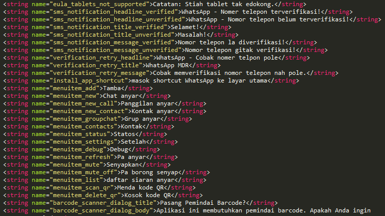 Kode di atas saya ambil dari scip atau koding di aplikasi whasapp yang saat ini saya oprek kodenya, Jadi yang berwarna biru di atas adalah kodinganya, dan yang berwarna mera adalah kode yang bisa anda rubah, agan juga bisa ganti kode yang berwarna biru atau scipnya jika agan sudh bisa bahasa pemerograman XML.