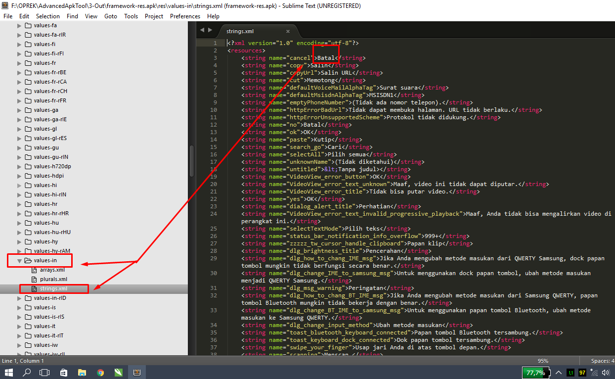 Dan masuk di bagian folder, fremework-res.apk => res => value-in => string.xml,